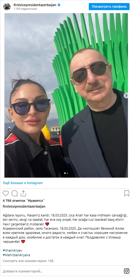 "Да ниспошлет Великий Аллах всем крепкое здоровье, много радости, любви и счастья, хорошее настроение в каждый дом, изобилие и достаток в каждый очаг! Поздравляю с Илахыр чершенбе!", - говорится в публикации на страницах Мехрибан Алиевой в социальных сетях.