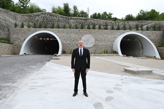 Президент Азербайджанской Республики Ильхам Алиев ознакомился с работами, проводимыми на автомобильной дороге Ахмедбейли - Физули - Шуша, принял участие в открытии первого тоннеля, построенного вдоль дороги.